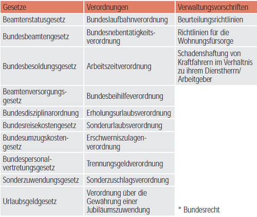 Neben den Gesetzen zählen Rechtsverordnungen und Verwaltungsvorschriften zu den weiteren Rechtsquellen, die das Dienstverhältnis der Beamten bestimmen. Rechtsverordnungen werden von der Regierung (wenn dafür eine Verordnungsermächtigung im Gesetz vorliegt) und Verwaltungsvorschriften (Rundschreiben, Verfügungen usw.) von der Verwaltung erlassen. Einige der wichtigsten Gesetze und Rechtsverordnungen aus dem Bundesbereich sind in der folgenden Abbildung beispielhaft dargestellt. Die Struktur der Vorschriften ist in den Ländern sehr ähnlich.